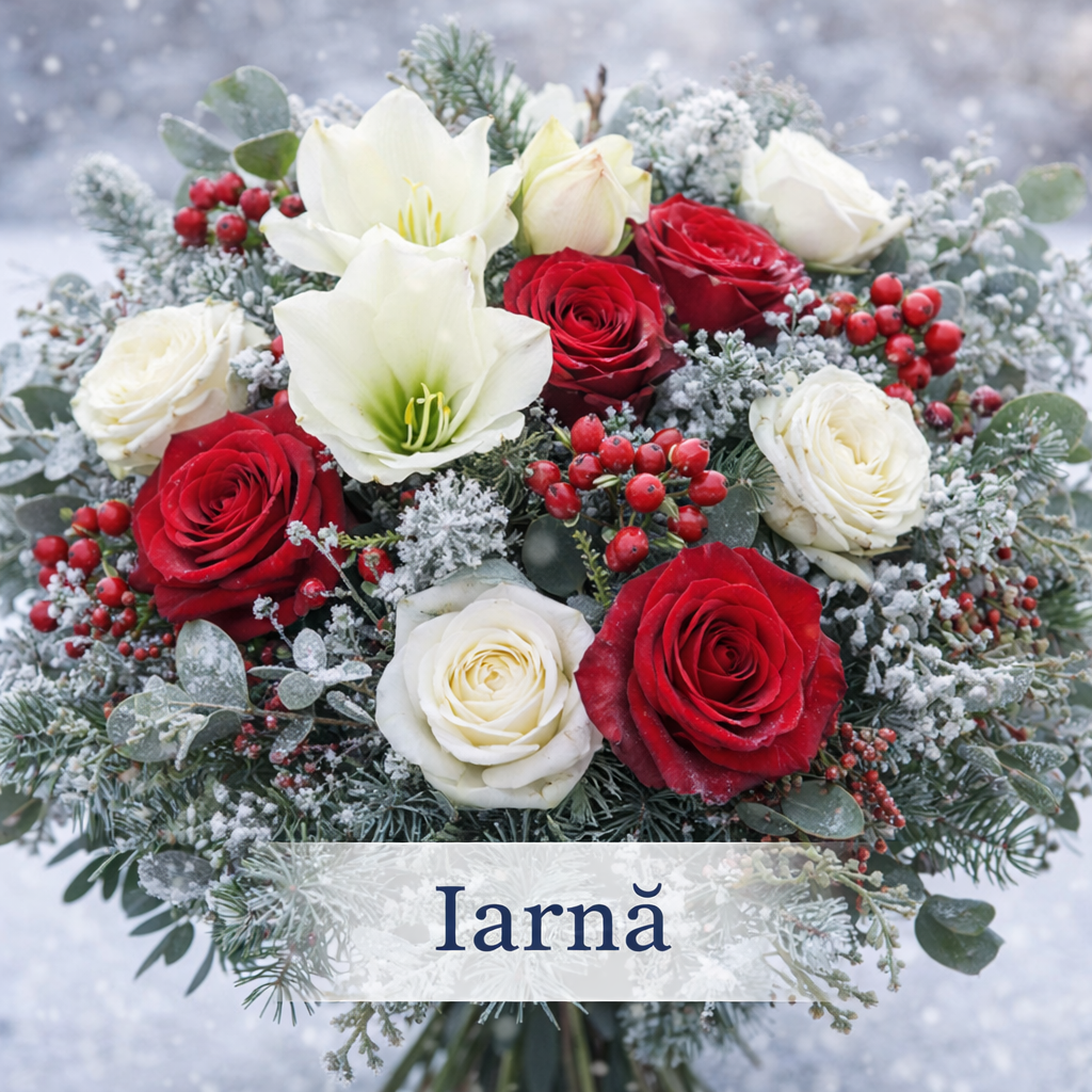 Deși natura pare în repaus, iarna oferă în continuare opțiuni florale, completate adesea de verdeață decorativă.